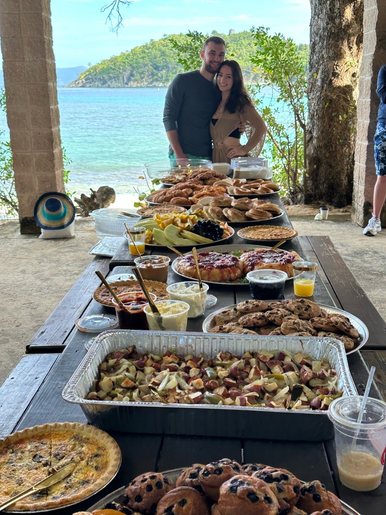 Our brunch was a feast. It consisted of Sam and Jacks Brunch Package: Fresh Fruit Platter; Wild Mushroom & Swiss cheese Quiche; Baked Brie With Strawberry Compote; Home Fries with Peppers, Onions, & Chipotle Ketchup; Assorted Jams, Jellies, Cream Cheese, Butter, and Peanut Butter; Assorted Fresh Baked Blueberry Muffins, Pastries, Croissants, & Toasted Bagels. We grabbed some lemonade and water separate from the catering menu and brought our own plates and utensils. It was delicious. This was a highlight of the trip for me.