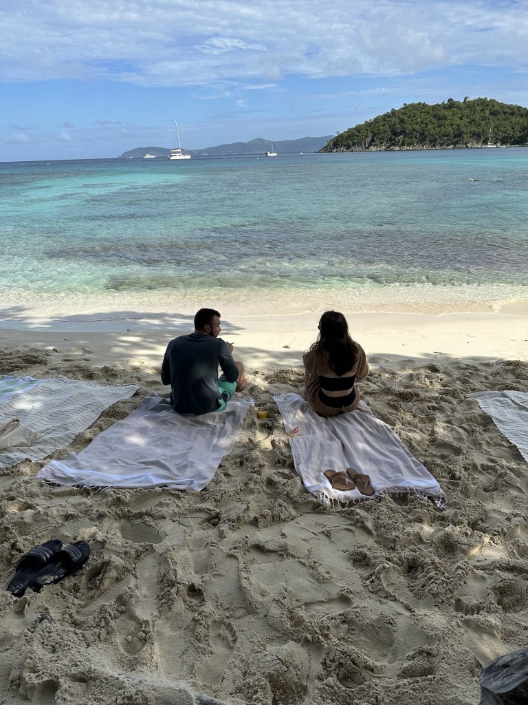 Maho Bay was a great choice for our day since they have food, drinks, floaty rentals, and bathrooms. Plus, the water is gorgeous. My bridesmaids laid on their custom made beach towels that I got them as a gift, and we all gathered like old friends, despite some of them never meeting. What a blast- having 2 families and friends all merge so well. Our time was cut short on Maho since we had to get ready for the rehearsal and sunset sail.