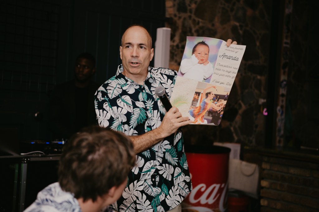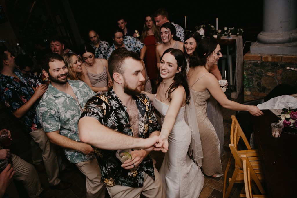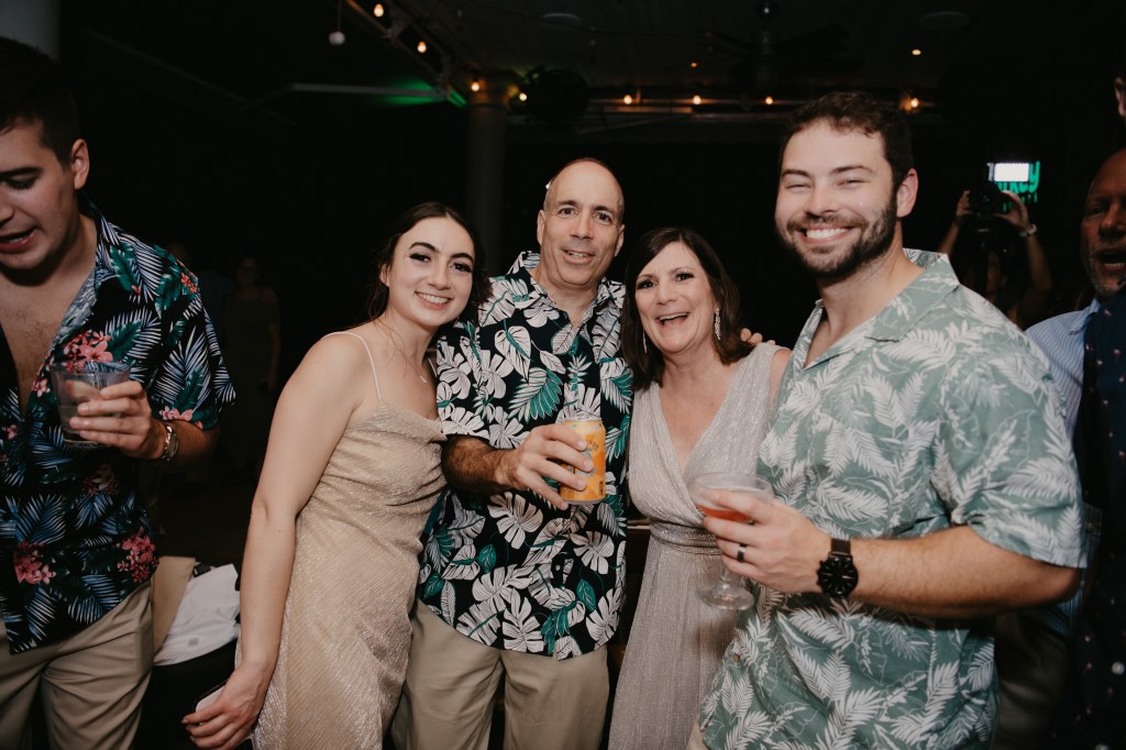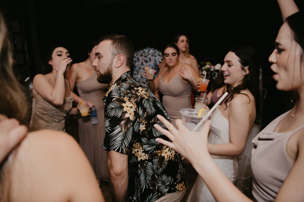 We had the groomsmen and our fathers change into Hawaiian style shirts for the reception. The shirts were gifts from Andrew to the guys.