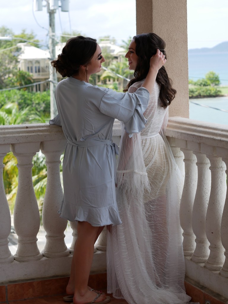 The hair and makeup women (Sugar and Spice Salon) arrived earlier than they told me they would. I can’t say I recommend booking them. My brother was still asleep on the pull out couch (near where they would be working.) We cleaned up quickly while they waited in the hall. My sister was the first to have her makeup done, and one of my bridesmaids started with hair. It was 9 am at this point. We had a beautiful view of the ocean and were gifted a rainbow this morning. We were full of laughs, singing to great playlists, and reminiscing. When we were all finished, we took pictures on the balcony–turned out to be some of my favorite pictures from the day.