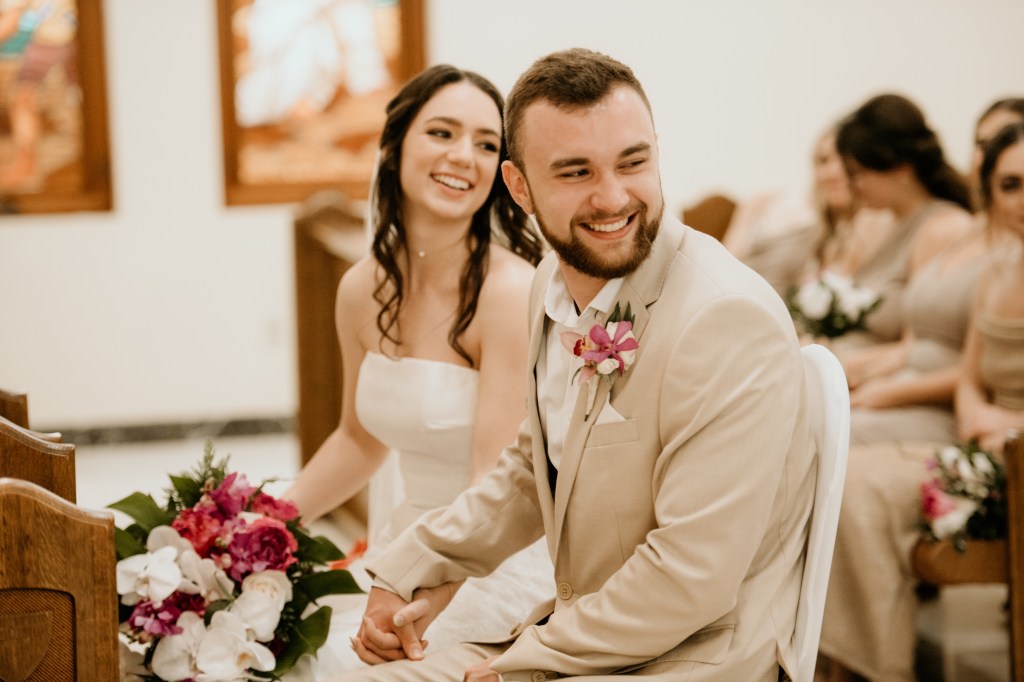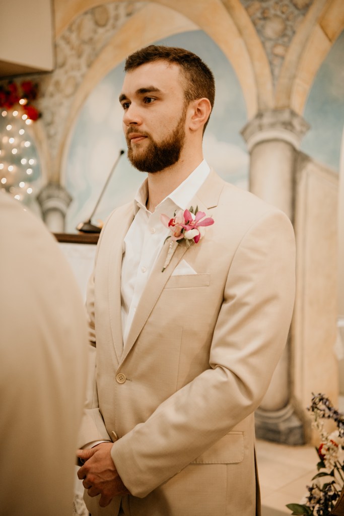 In the church, I saw Andrew had his back to the entrance so he couldn’t see me enter. I saw the groomsmen laughing, patting the groom on the back, and having fun. My bridesmaids and my parents went upstairs with me to wait, but we did have a view of down below so we could still watch what was happening with the guys. I found out after that it was the priest who wanted Andrew’s back to the entrance and could only turn around once I was walking down the aisle. I liked that idea.