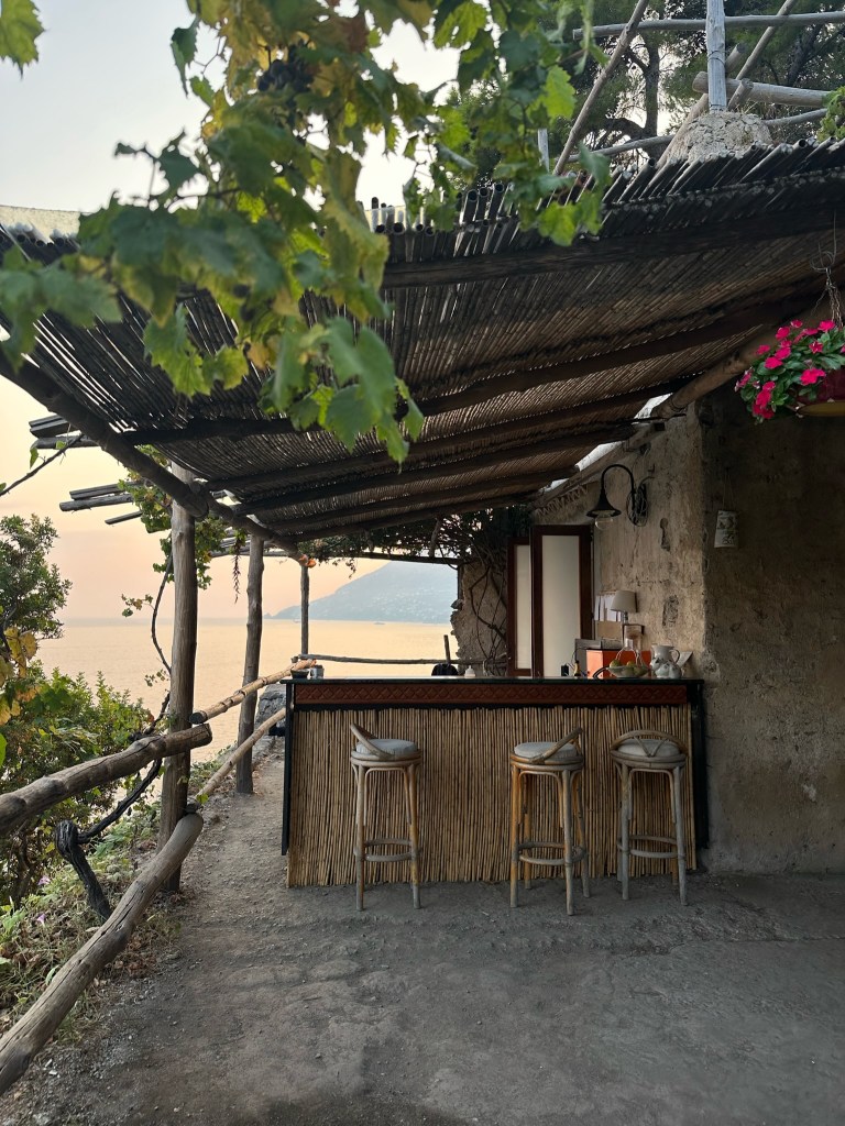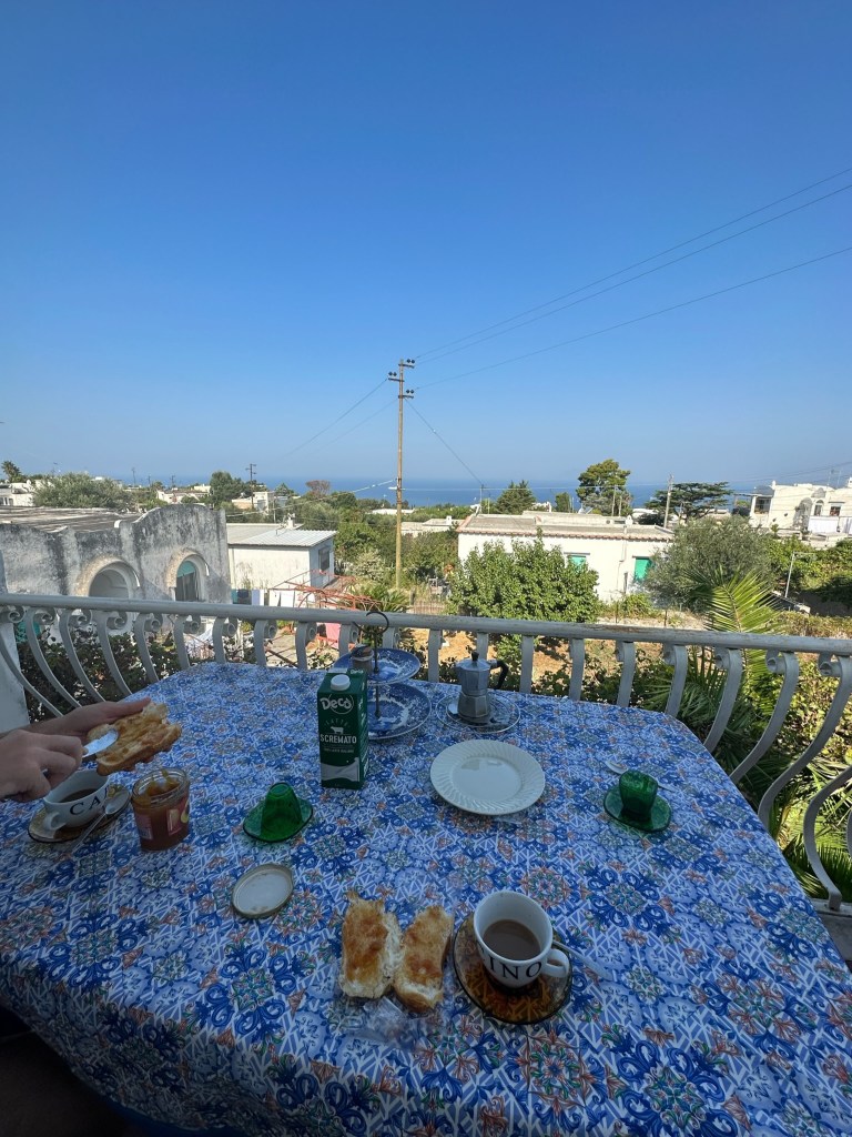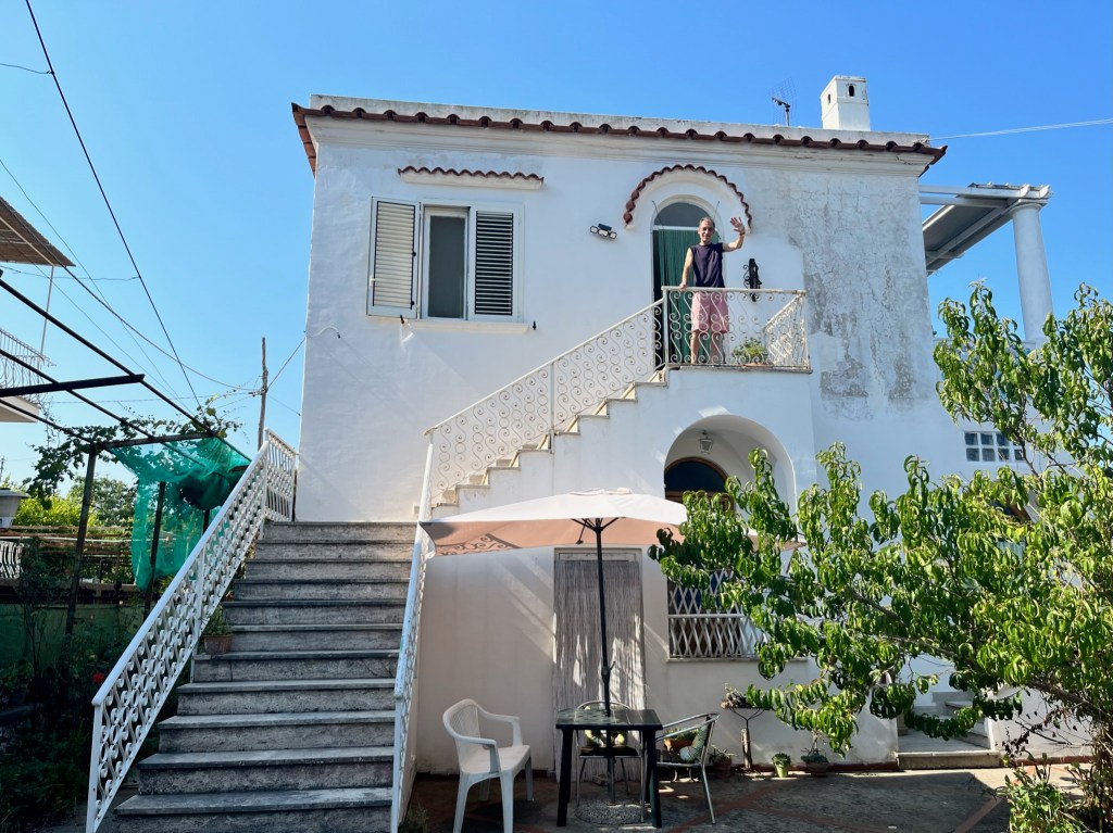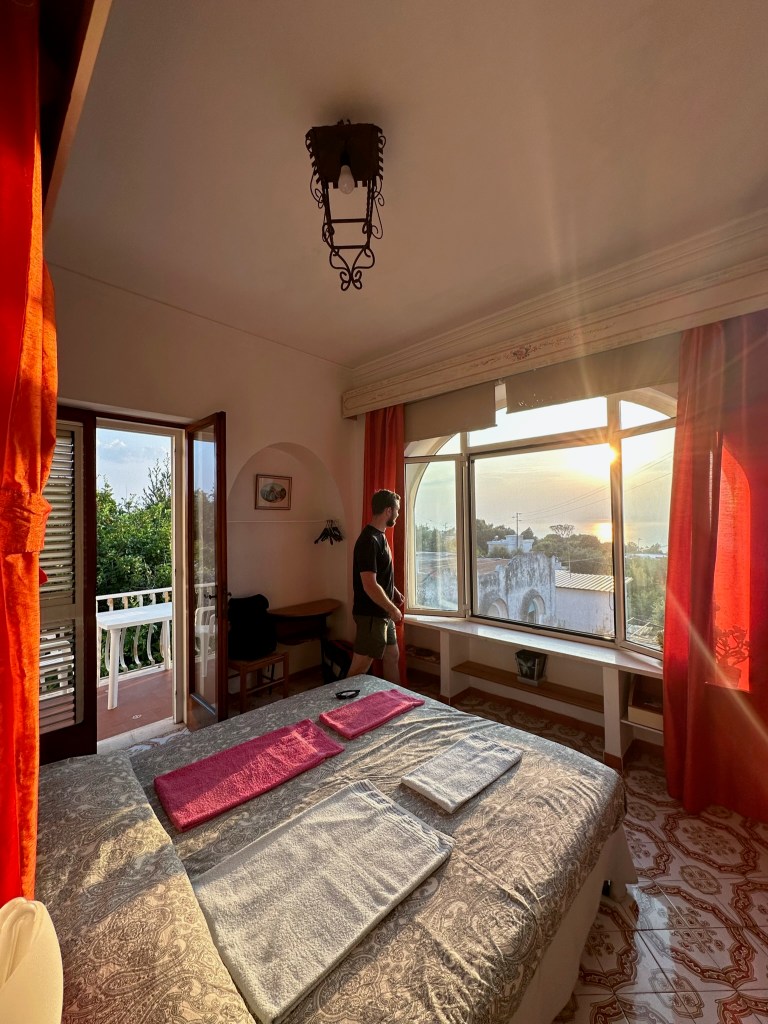 Arrive at the Airbnb in Anacapri. Our host, Enzo, was very friendly and greeted us with lemon water. This place had a view of the sunset over the water.