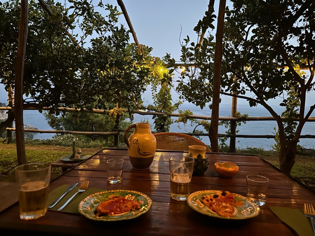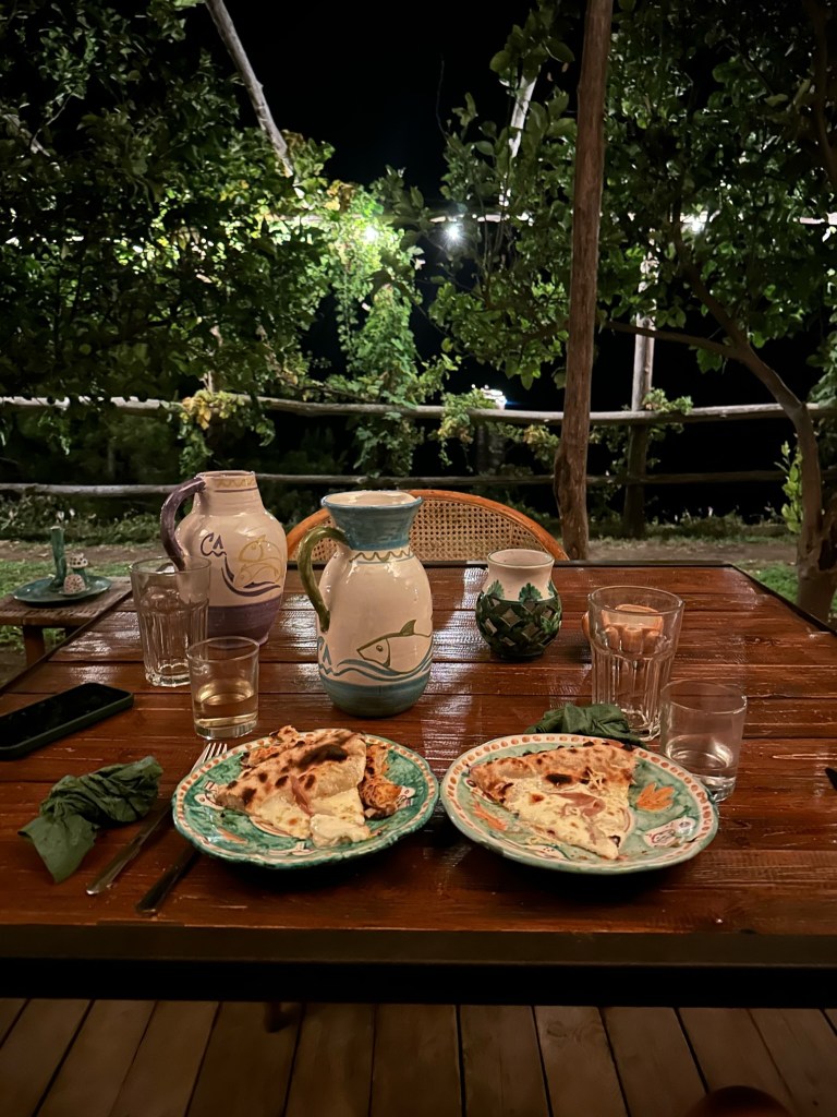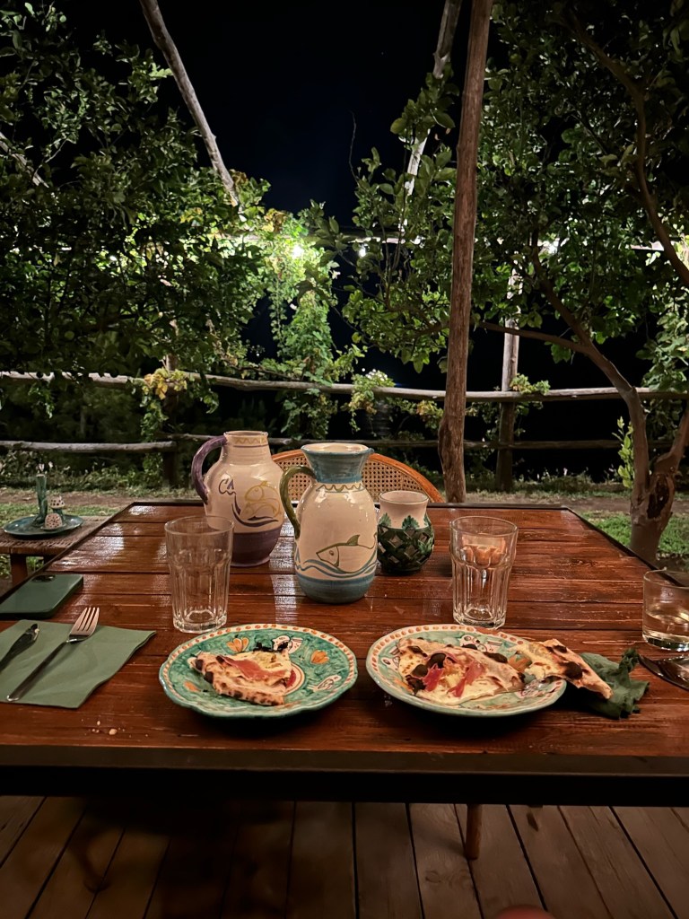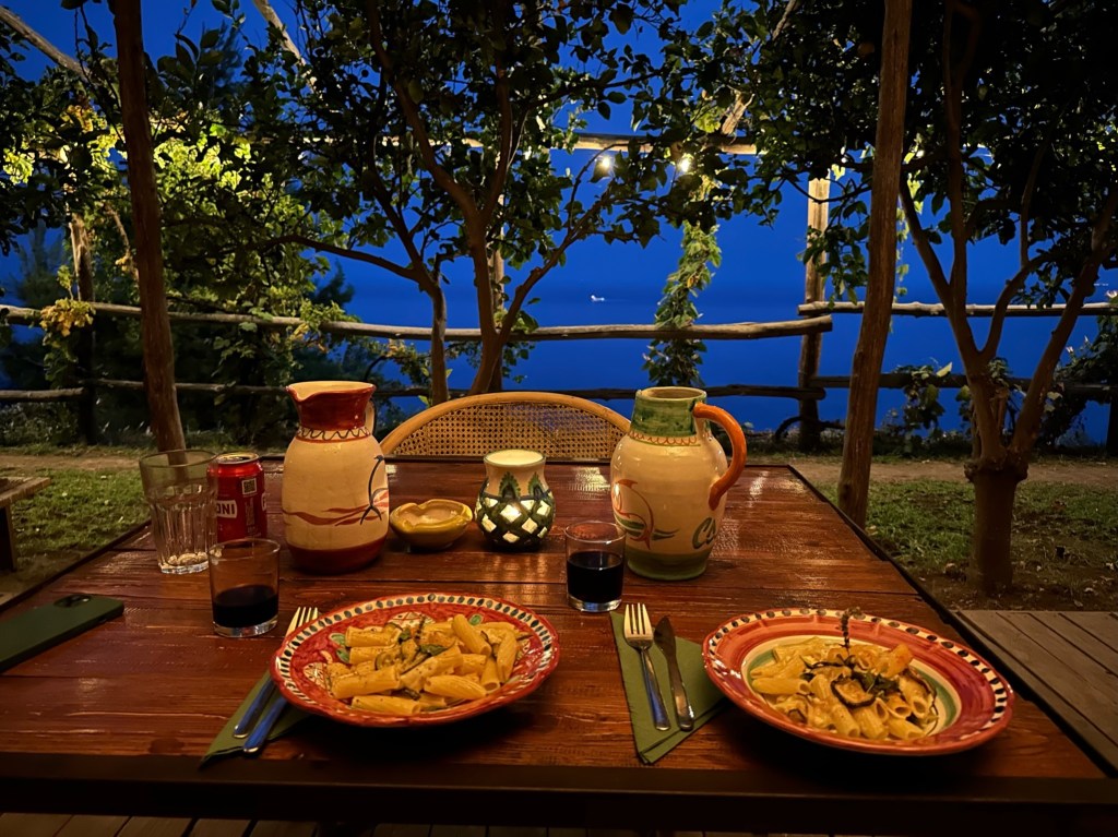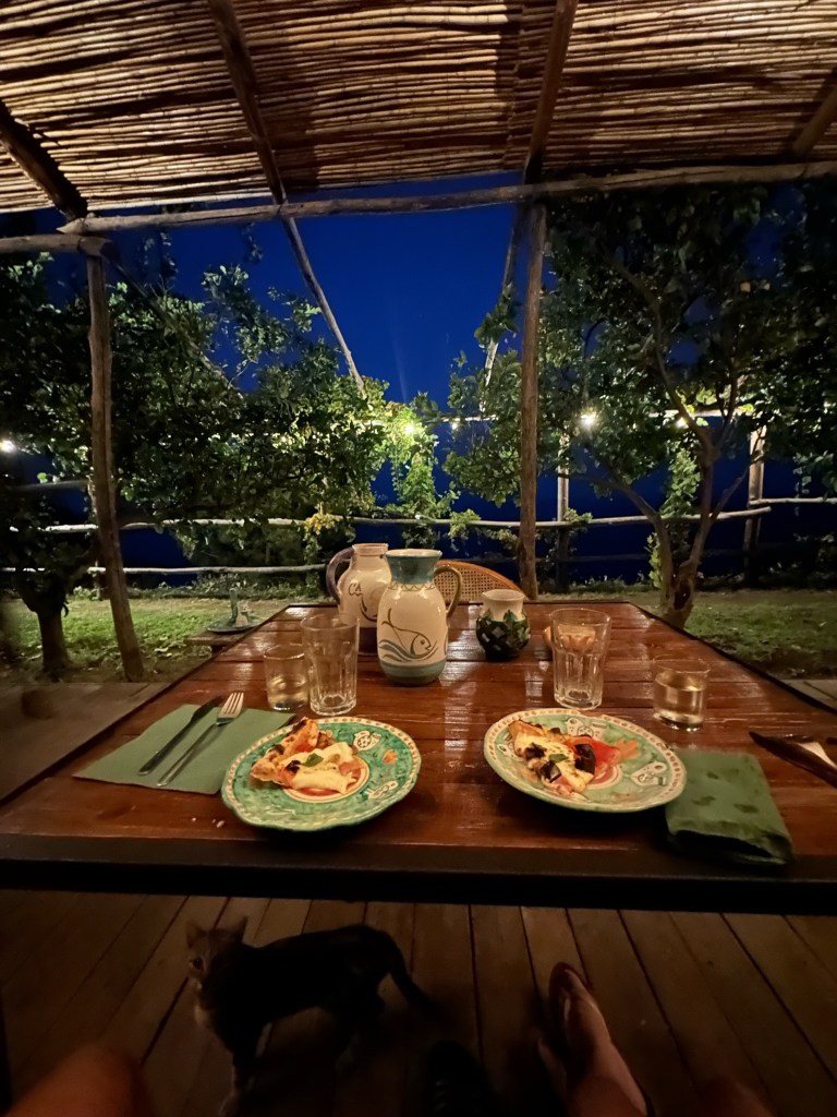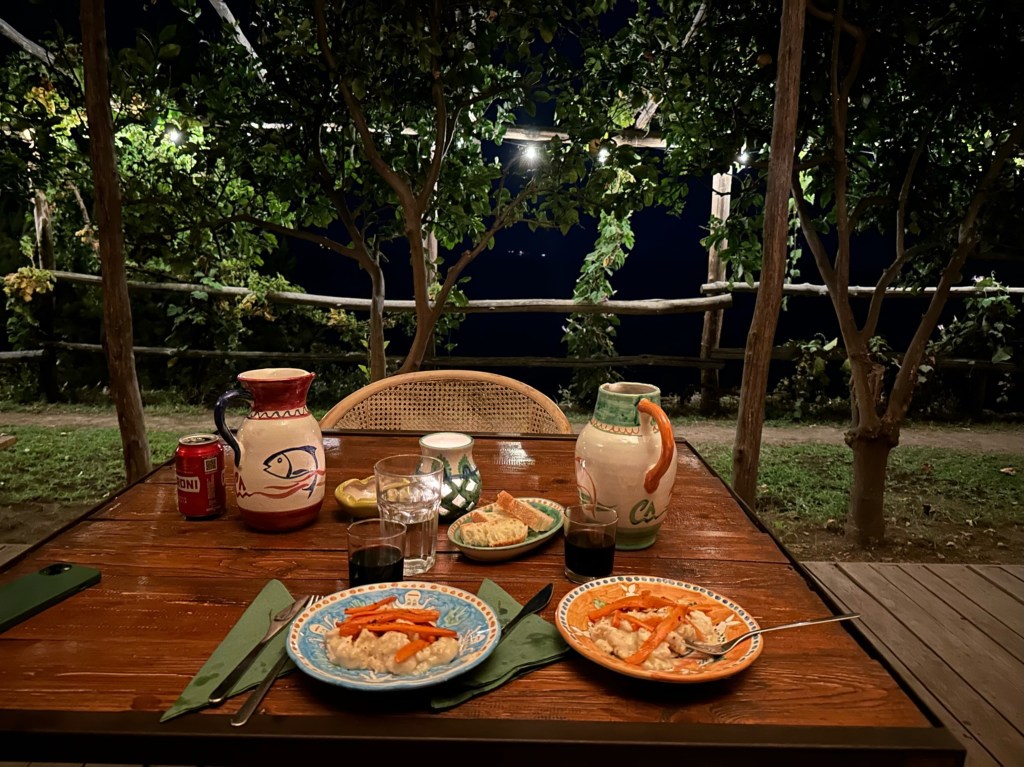 Cannaverde was a highlight of the trip. We had a private bathroom, a yurt tent, a shared infinity pool with a view overlooking the sea, and other relaxation stops. Our tent was next to the eggplant famr, and of course under lemon trees. The owners use this camp as a lemon farm in the winter and rent it out for tents in the summer. It was so hot during the day, but the tents cooled down enough at night that it was quite comfortable. They know what they are doing when it comes to food…each night there are group dinners you can pay extra to participate in. We decided to give it a try because we felt like we traveled enough that day and didn’t want to go back to the town of Maiori.
