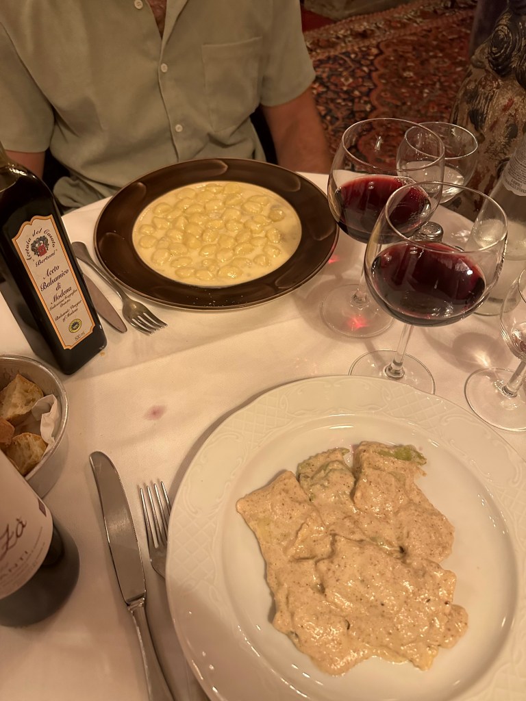 At Trattoria Za Za, we ordered a pasta dish first, followed by our main course. This is very typical in Italy and other parts of Europe, to have pasta (gnocchi, ravioli, etc) as a first course. Then a meat or something not pasta as your main food. We indulged in this tradition, starting with Creamy Walnut sauce Ravioli & Gorgonzola cheese Gnocchi. Then we ate Melanzane alla Parmigiana (eggplant with sauce and cheese) & Florentine style Ossobuco with mushrooms and a side of white beans “All’Uccelletto.”