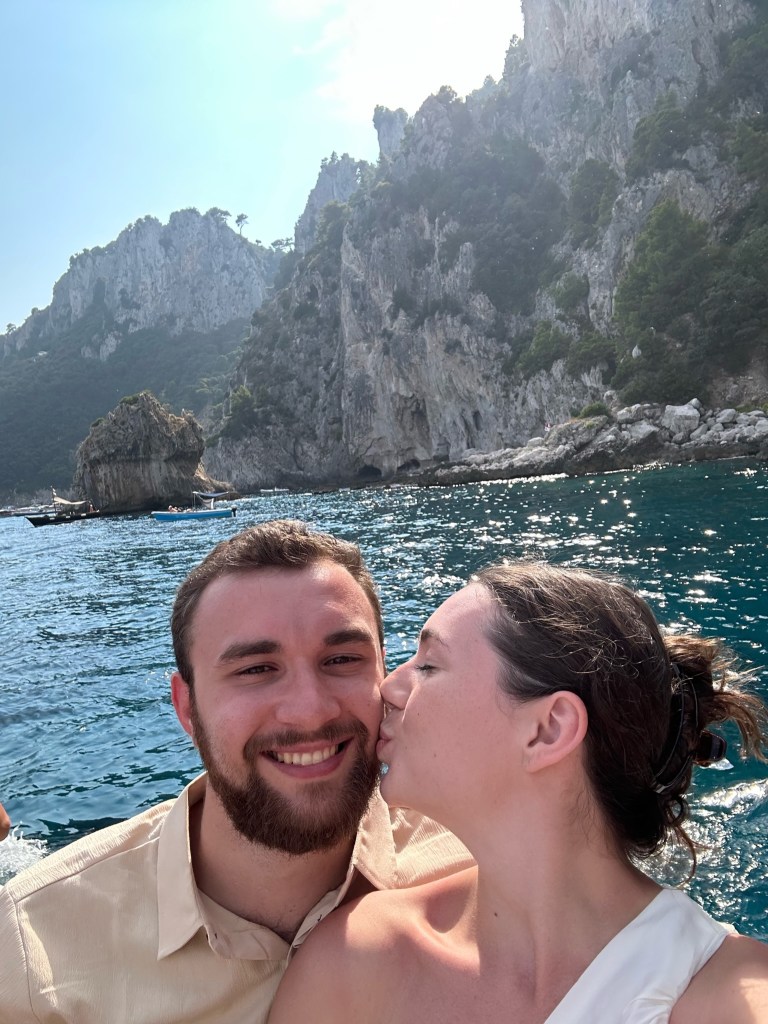 Relax on the Capri Coast to Coast Boat Tour from TripAdvisor: It left from the ferry port, so we hopped on. We saw the Green and White grottos, but opted not to pay extra for the blue grotto. We kissed while going under the Faraglioni arch, as you must for a lifetime together! This boat ride took us the whole way around the island of Capri.