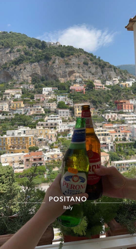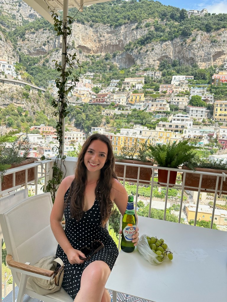 We went up the stairs, straight to Latteria – The Wine and Cheese Shop. Here, we bought Peroni beer and green grapes, while alone on their balcony with a view of all of Positano. It was so crowded, so this was a needed time away from others.