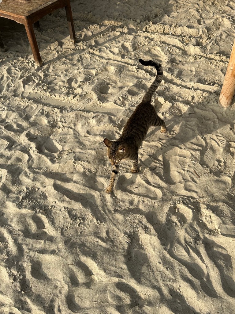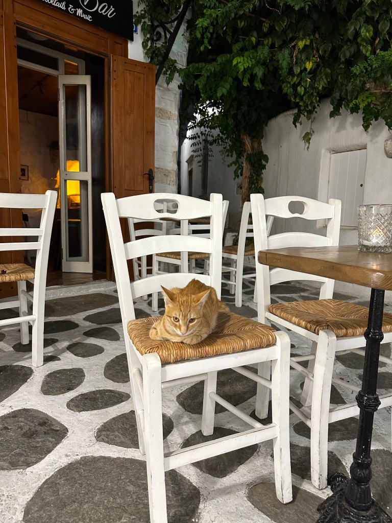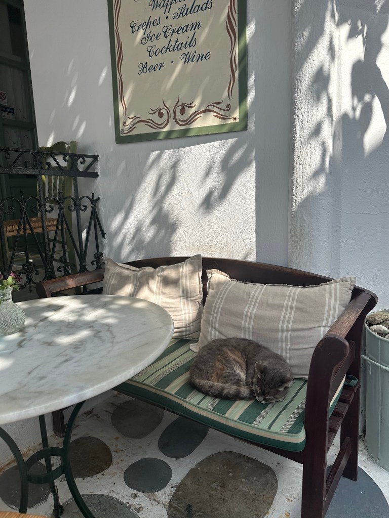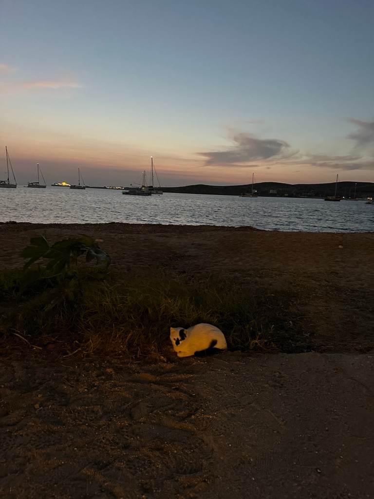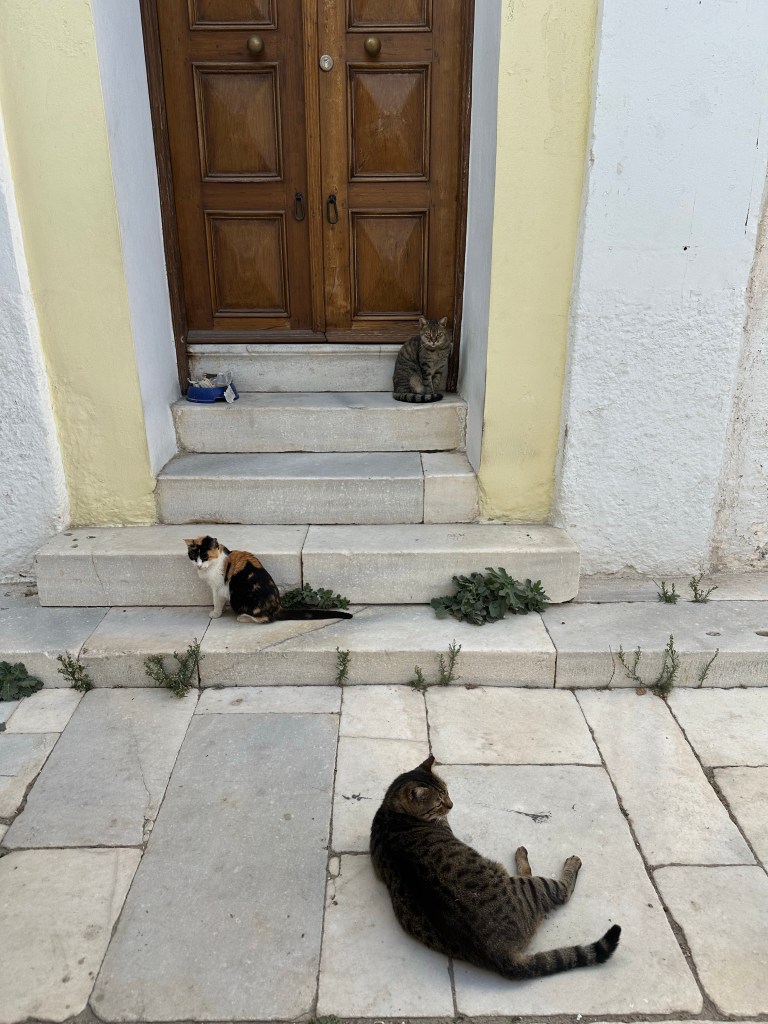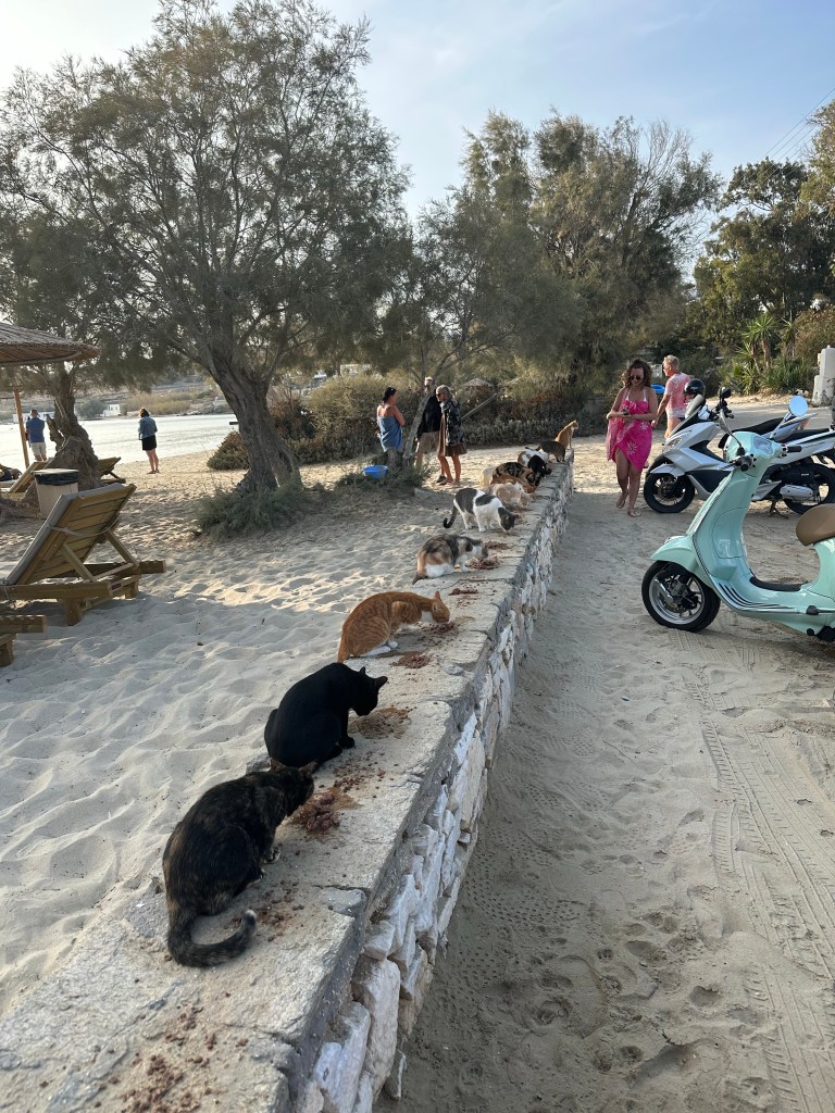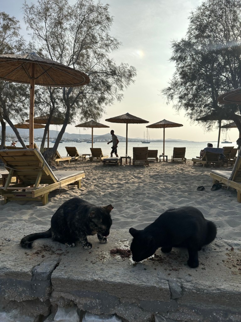 Rent a beach chair on Livadia Beach. Since it was off season, it was 10 euros for 3 beach chairs. It is much more than that during peak season. We ordered margs and enjoyed the view. It was too cold to swim, but I had other forms of entertainment. Cats! There are many cats who live on the beach and a fed by locals. We were there for their dinner time!