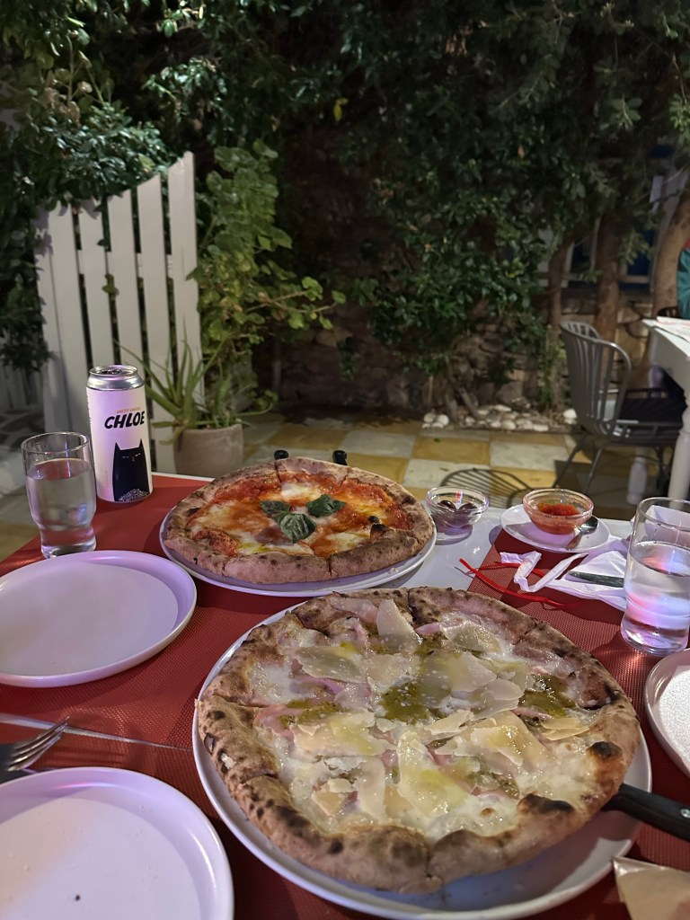 Dinner at Cuore Rosso for pizza. We ordered a margarita and a white pizza with pesto. I had an IPA, which was the only IPA I have ever enjoyed. It was their Jasmine IPA. This is a very highly rated restaurant in Paros. You just might have a few cat visitors asking for your pizza!