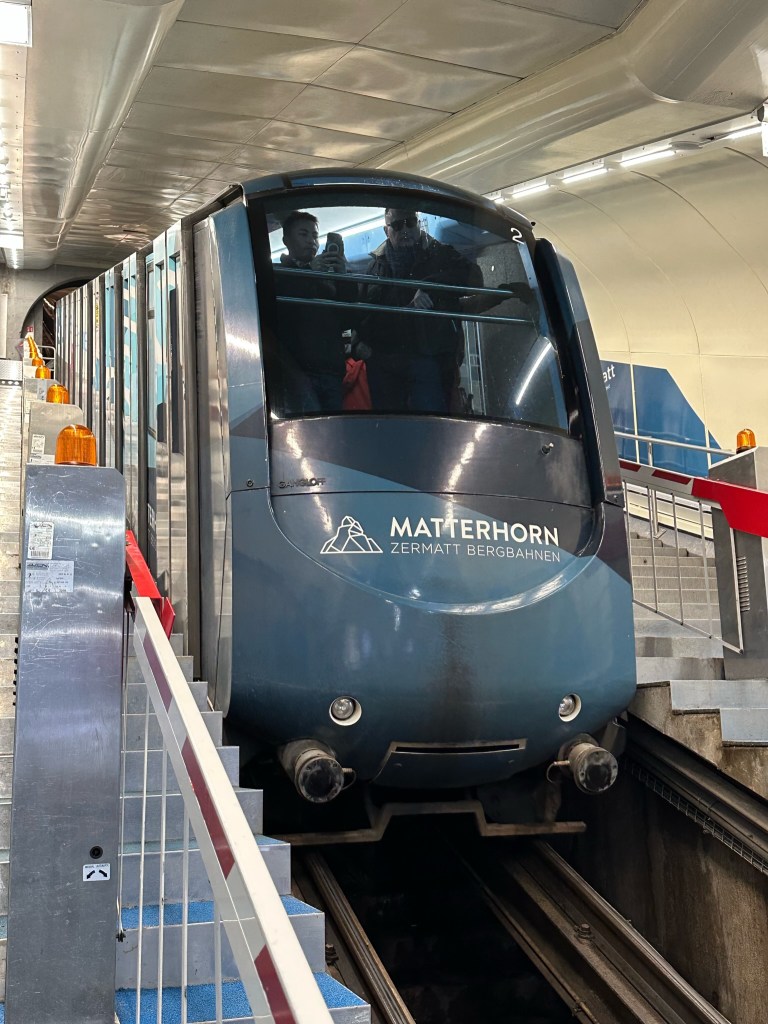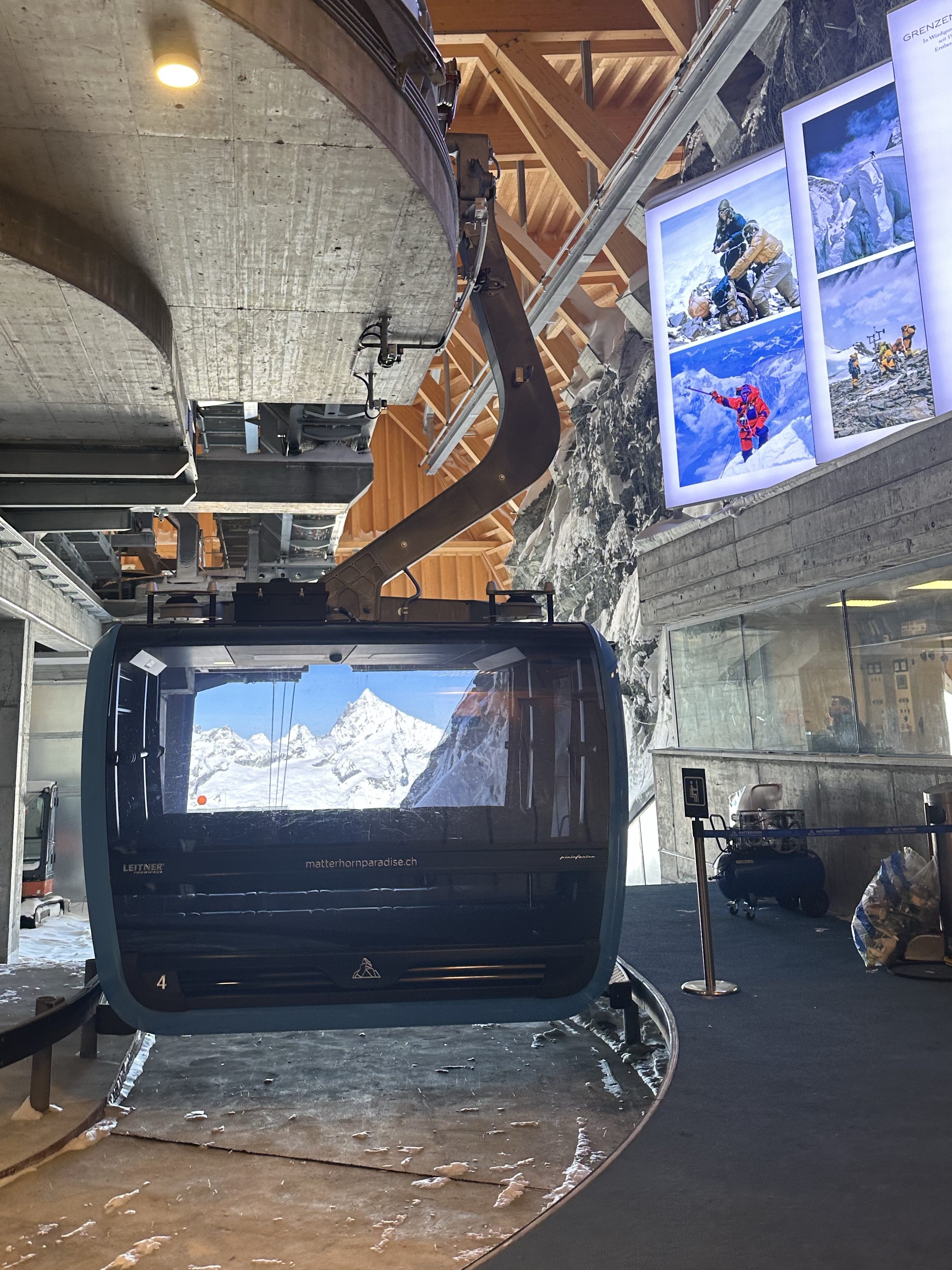 Start at Zermatt’s Cable Car station, a decent walk uphill from the center of town. You will really only have one Cable Car option, so scan your ticket and just hop on a Cable Car. If you are skiing, this is the way to the ski slopes, and there are slots on the outside of the cable car to put your ski gear!