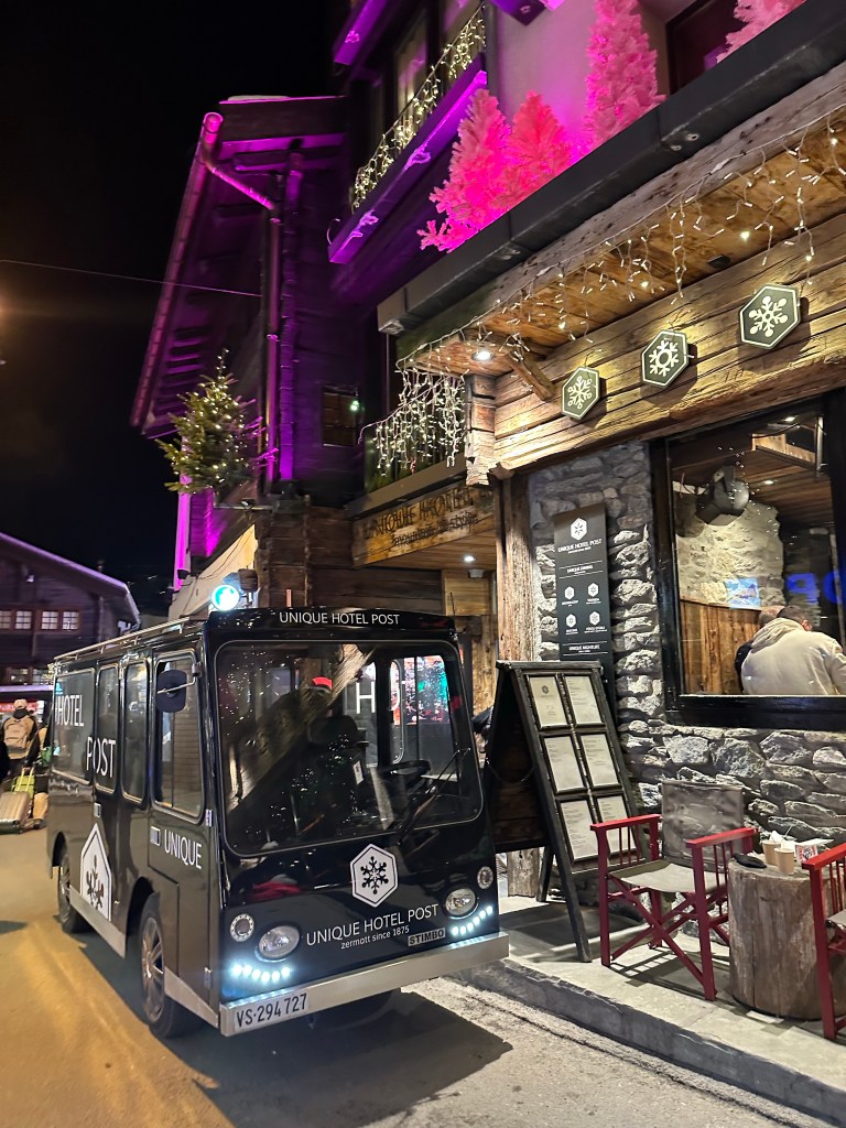 Despite a cogwheel train necessary to arrive to Zermatt, it was really not that difficult to get there. I was already in Basel for the Christmas Markets, so I took an easy train ride to Visp, then the cogwheel from Visp to Zermatt on the “Matterhorn Gotthard Bahn.” It was a quick walk for us from the train station to our apartment, but there were electric taxis scooting around for those who would prefer them, or for those with a lot of ski gear. (Even though Zermatt is car-free, these tuk tuk like vehicles zoom past you quite frequently and quickly…but very quietly.)