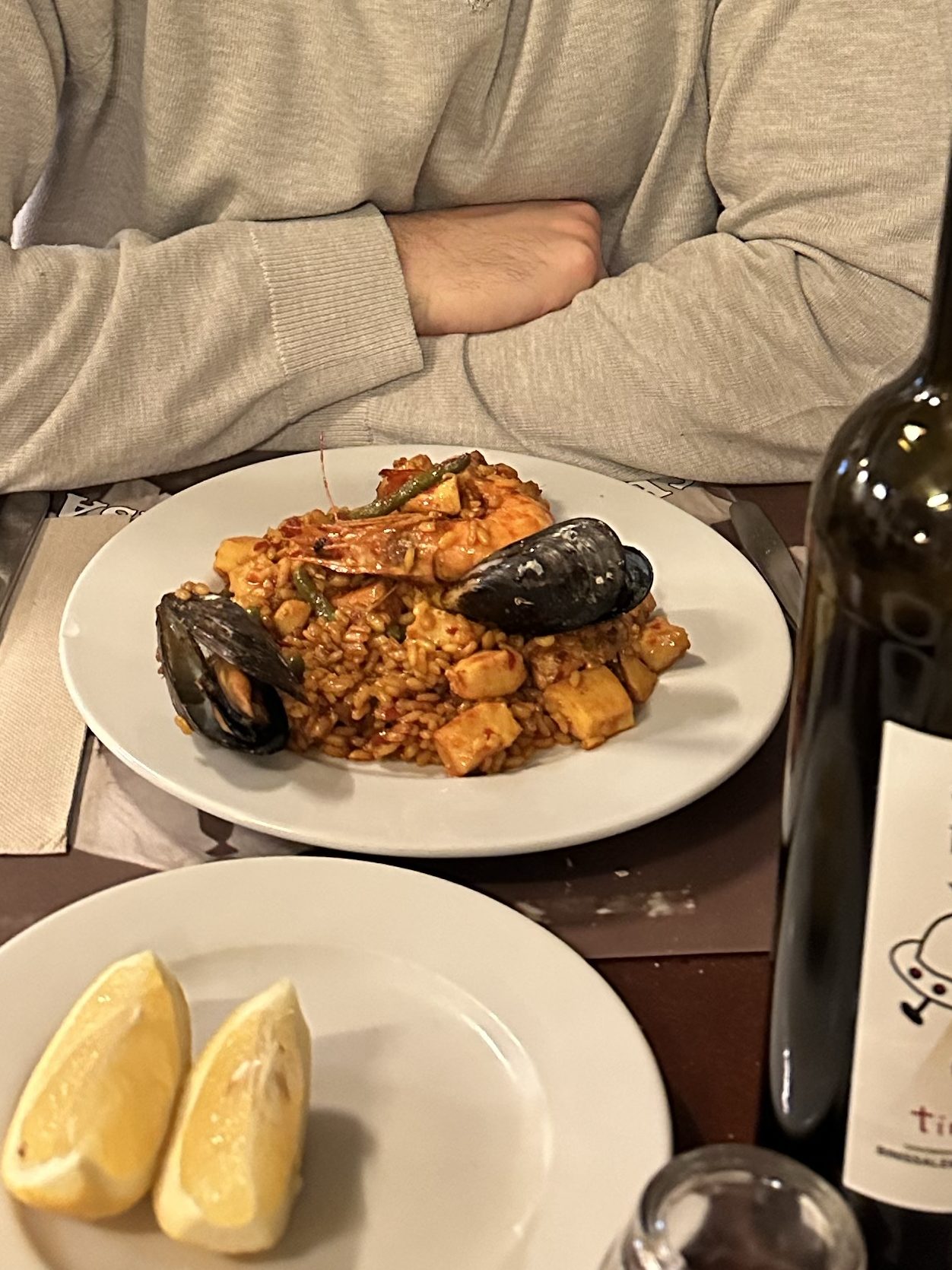 (We sent our friend from Spain a picture of this paella and asking if it looks authentic. He responded and said “it looks good to me!” So, you might be in the clear eating here! Andrew ordered the mixed paella so he could try all different types of seafood in it, and was pleasantly surprised and really enjoyed it. I ordered a bottle of wine from Mallorca, which was also delicious (and inexpensive!))
