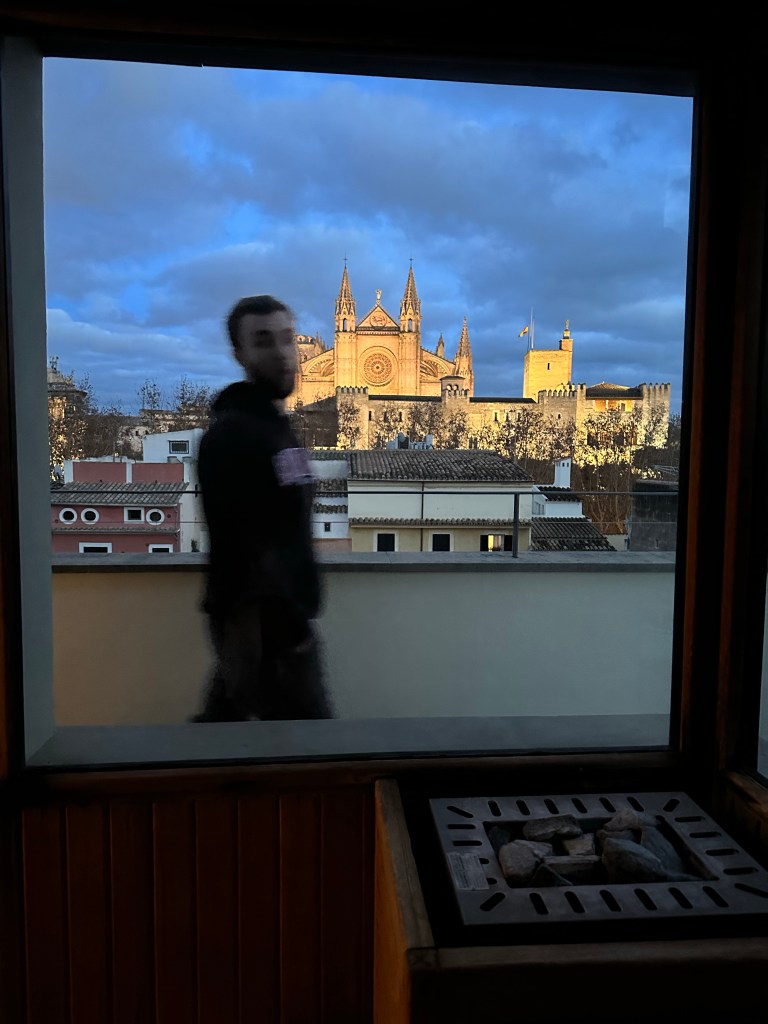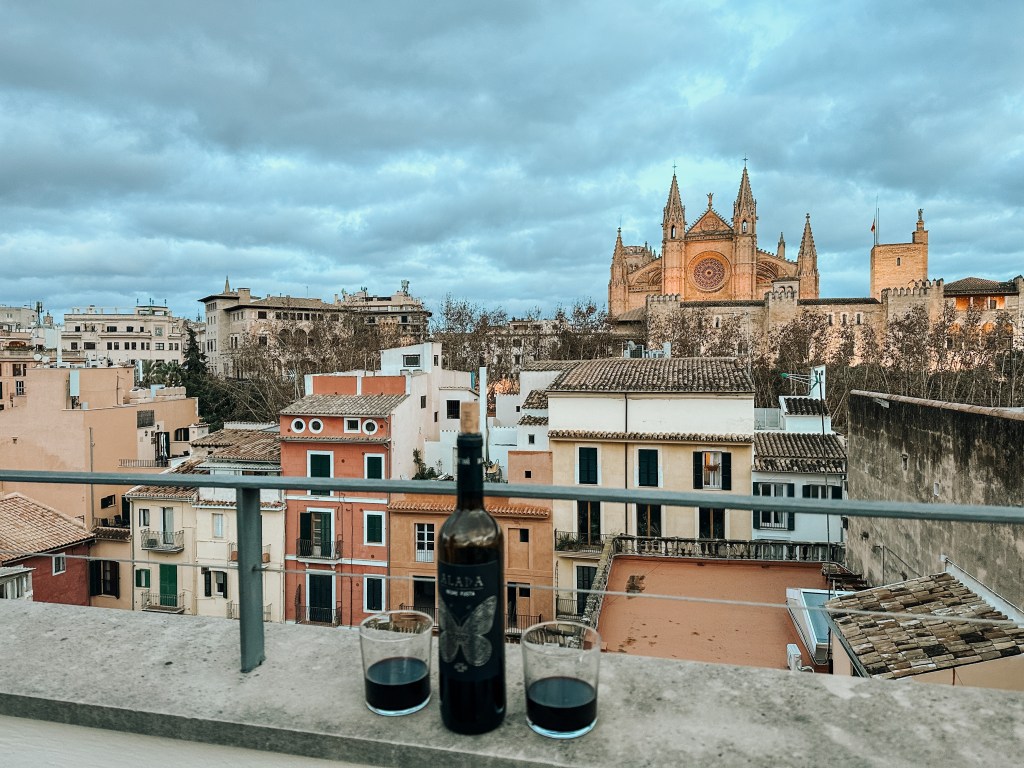 Eager to drink our Mallorca wine we bought in Sóller, we ran up to our hotel’s rooftop to sip our wine and watch the sunset. We were the only ones up there and the rooftop had a sauna, so we had that private, too! We admire the cathedral and the most colorful, beautiful buildings in Palma from our front row rooftop seats!
