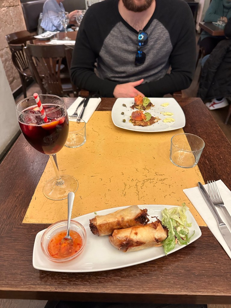 We ordered sangria, vegetable spring rolls, and grated potatoes with smoked salmon and guacamole.