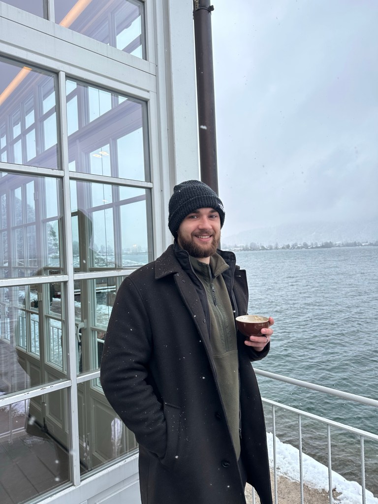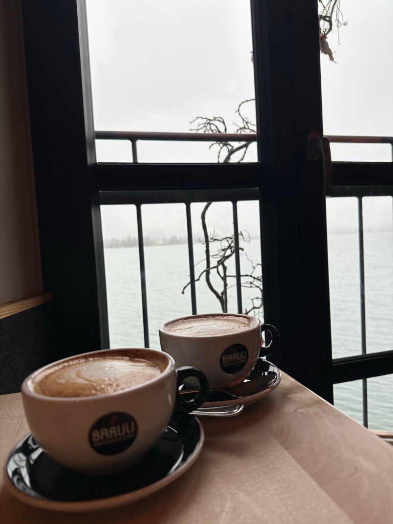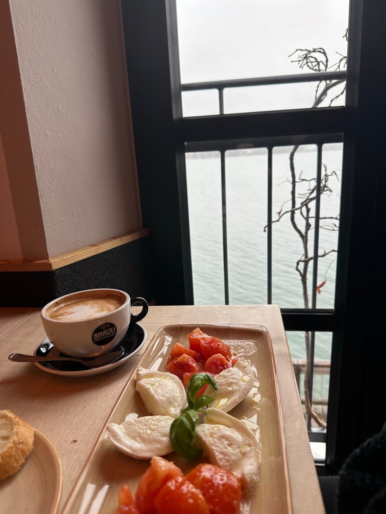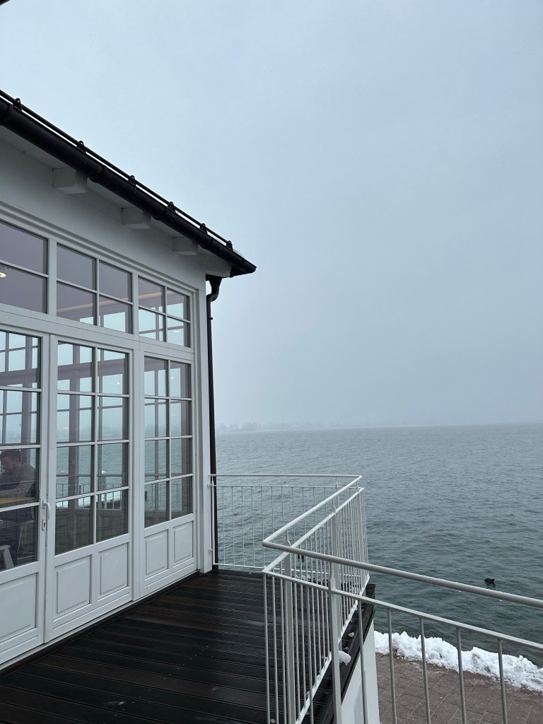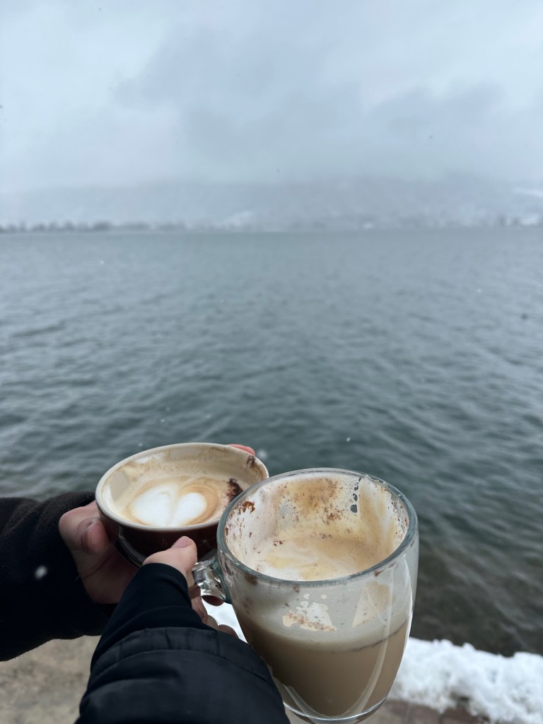 Aran, a popular cafe, especially for a snowy weekend day, was a perfect spot for a warm cup of coffee. Located on the water, it stuns with its glass windows and delicious menu. Since it was so full inside, we chose to sit outside to have views of the lake, even though it was so cold and snowing!