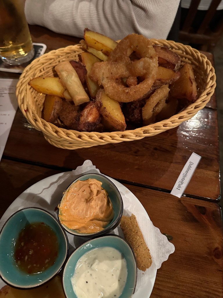 The Dubliner was the only restaurant we could make a reservation at. We were hoping for it to be a little bit later than 1800, but it worked out since we could stay until 2100! We had fun with our beers and this fried food basket for “dinner,” since we were still full from our lunch.